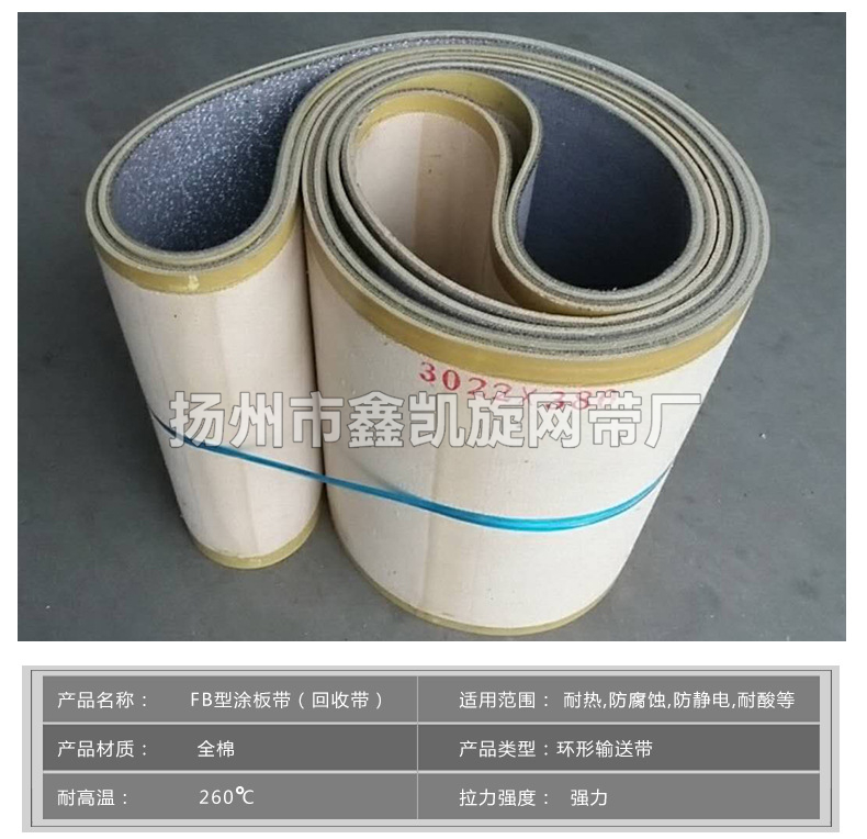 订货号 : 0894加工定制 : 是货号 : 019样品或现货 : 现货是否标准件 : 非标准件是否进口 : 否品牌 : 鑫凯旋型号 : FB材质 : 纯棉输送带类型 : 环形输送带适用环境 : 耐磨,防静电,耐酸,防潮,耐碱应用范围 : 应用于铅酸管式蓄电池极板涂板机常用规格:6 x 740 x 2540, 8 x 670 x 3890